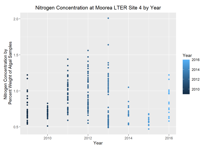 - Truthfully, I was not expecting there to be such a small effect from nutrient pollution (nitrogen concentration) on annual larval recruits. I decided to take a look at my 7 year data set I used in the previous linear regression model to see how nitrogen concentration has been changing over this time period.