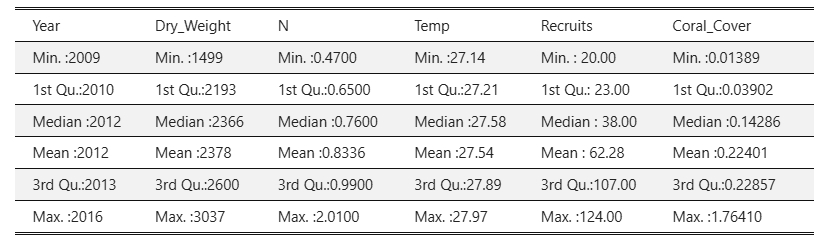 - With a bit more data to use (about 220 observations), I could now get a little bit better of an idea as to how algal biomass, nitrogen concentration, and coral cover were distributed by year.