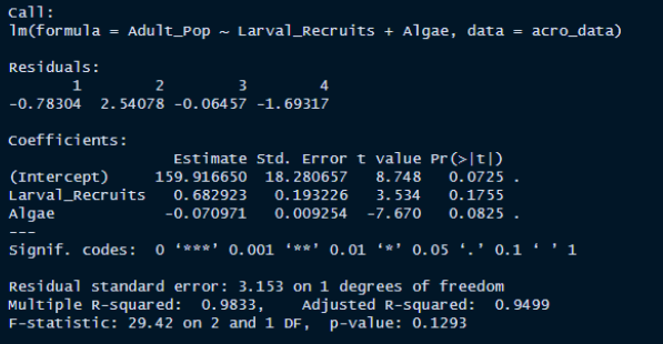 - This lack of data meant that I could not run a linear model with an interaction coefficient, and thus chose to look at the relationship between algae, larval recruits, and adult population size.