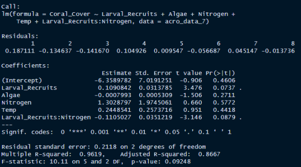 - I was interested to see if there was any correlation between nitrogen concentration and larval recruitment for this region, and what effect this would have on the adult coral population. Ultimately, I decided on a linear regression model with an interaction clause between nitrogen and larval recruits, and coefficients for the effect of temperature, algal biomass, and larval recruits to predict the adult coral population. My hypothesis were as follows: