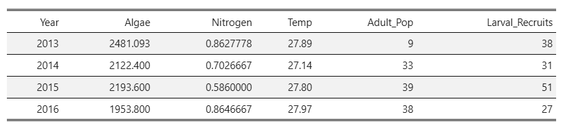 Therefore, I was not able to assess the effect of seasonality on nutrient pollution and larval recruitment (two highly ephemeral phenomena. After filtering to years of overlap between all sets, data was cleaned and I began joining sets to allow for ease of summary.