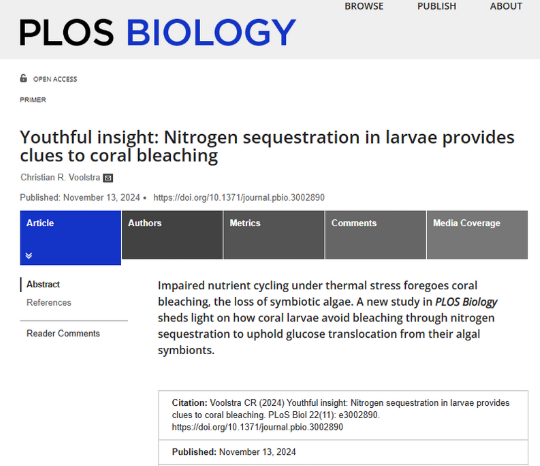 Voolstra CR (2024) Youthful insight: Nitrogen sequestration in larvae provides clues to coral bleaching. PLoS Biol 22(11): e3002890. https://doi.org/10.1371/journal.pbio.3002890↩︎