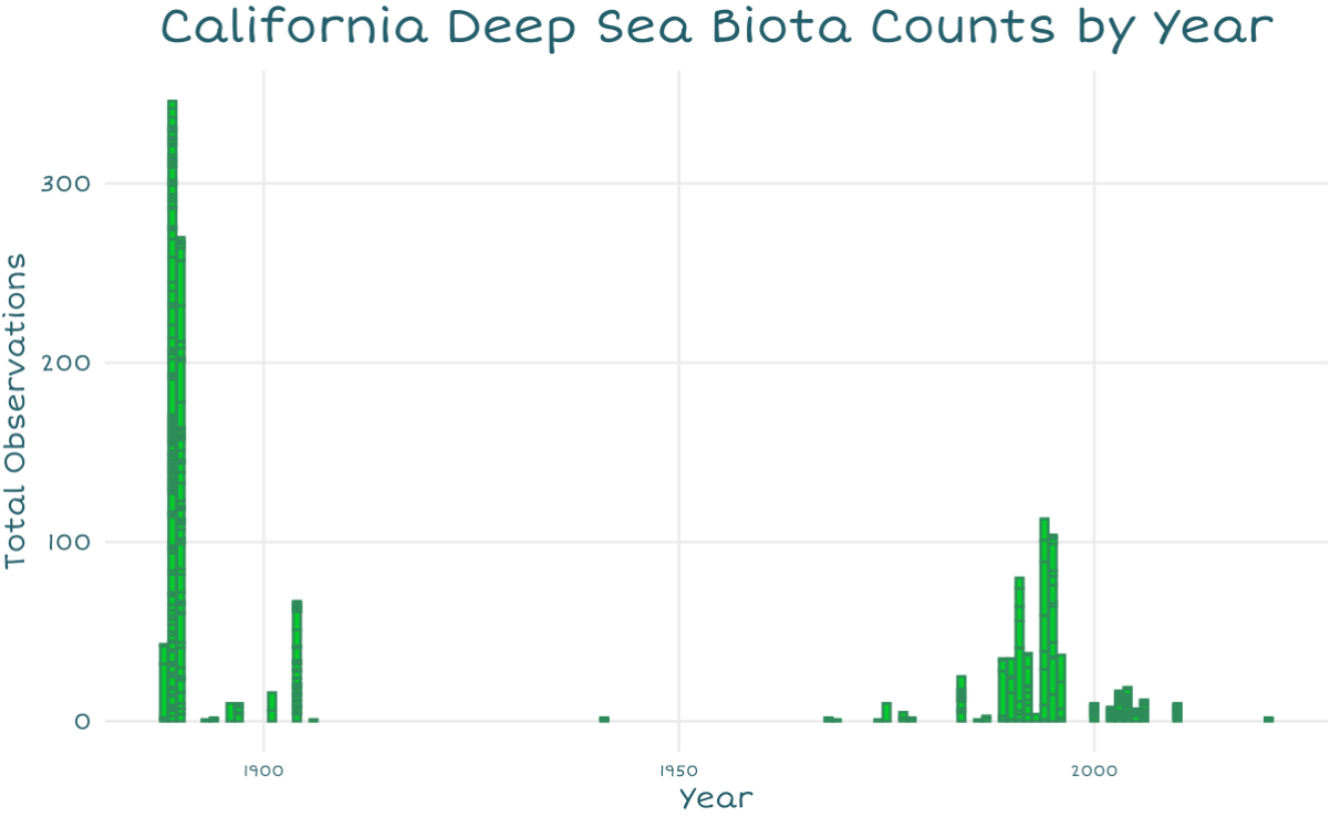However, as I looked into the data, I realized that sampling efforts of deep sea benthic biota has been few and far between. While recent efforts from the West Coast Deep Sea Coral Initiative gave us samples from 2018 to 2021, the previous sampling period of a comparable magnitude occurred from 1888-1900.